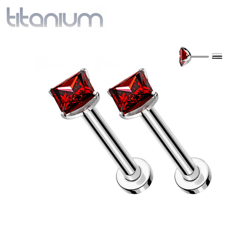 Pair of Implant Grade Titanium Threadless Square Red CZ Gem Earring Studs with Flat Back