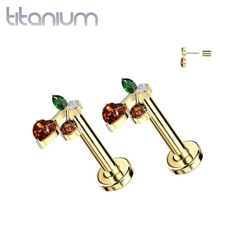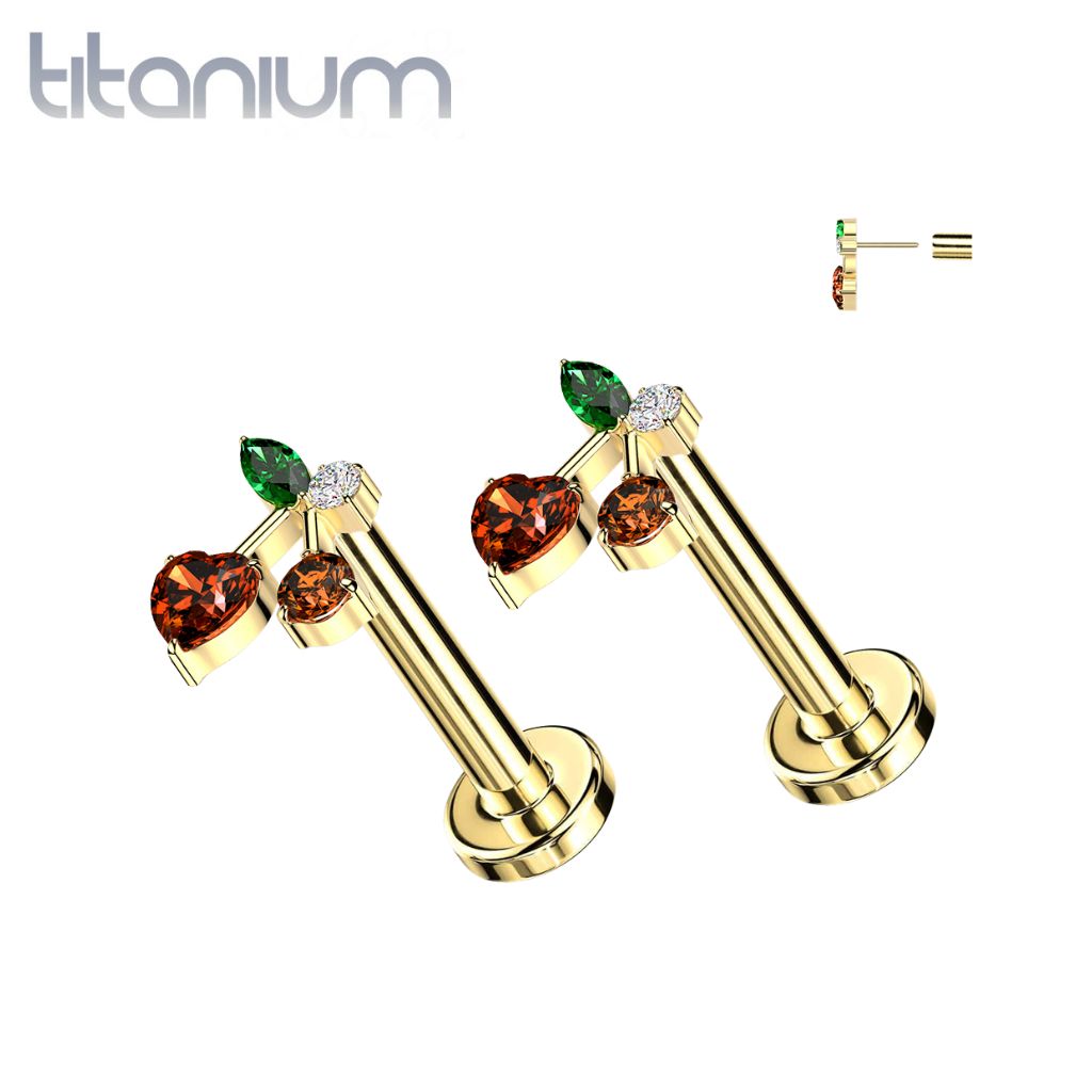 Pair of Implant Grade Titanium Gold PVD Red CZ Heart Cherry Cute Push In Threadless Earrings With Flat Back