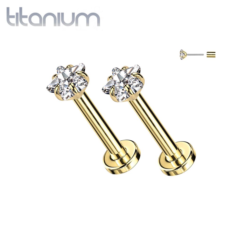 Pair of Implant Grade Titanium Small Dainty Gold PVD White CZ Star Push In Earrings With Flat Back